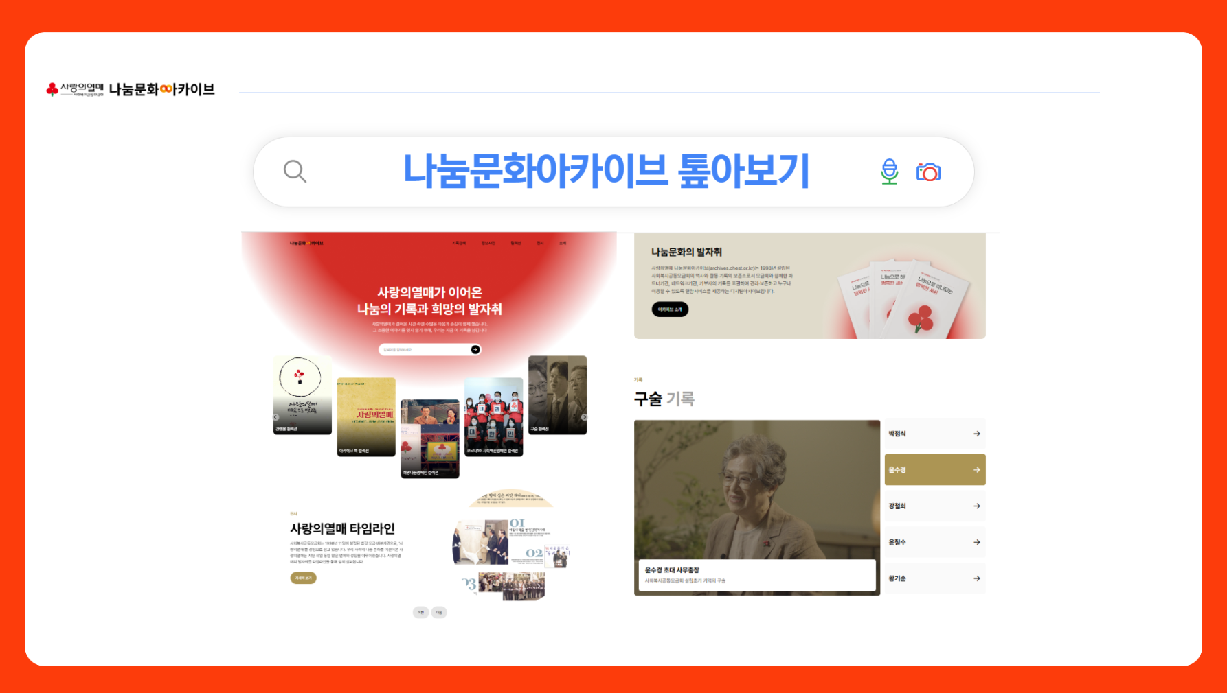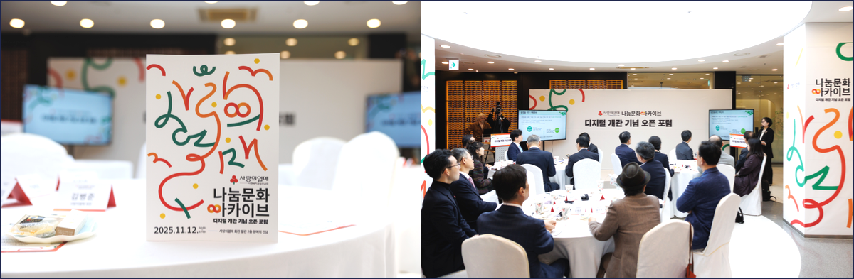 지난 11월 12일 사랑의열매 회관 별관에 위치한 <명예의 전당>에서, '사랑의열매 나눔문화아카이브'의 디지털 개관을 기념한 오픈 포럼이 열렸습니다. 사랑의열매와 함께 나눔문화의 발전을 이끌어온 주요 인사들과 기록 분야 전문가들이 한자리에 모인 자리, 나눔의 기록들이 꽃피울 미래를 함께 그려본 감동적인 현장을 후기에 담았습니다✨ 오픈기념 전시회는 2026년 2월 20일까지 사랑의열매 회관 본관 1층 로비에서 계속 진행되니 많은 관심 부탁드립니다!